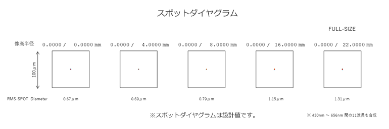 ●スポットダイアグラム直径は、中心で約0.67μm※1、フルサイズ最周辺でも 1.31μm※1という、回折限界のエアリーディスクよりも遥かに小さな値で設計されています。