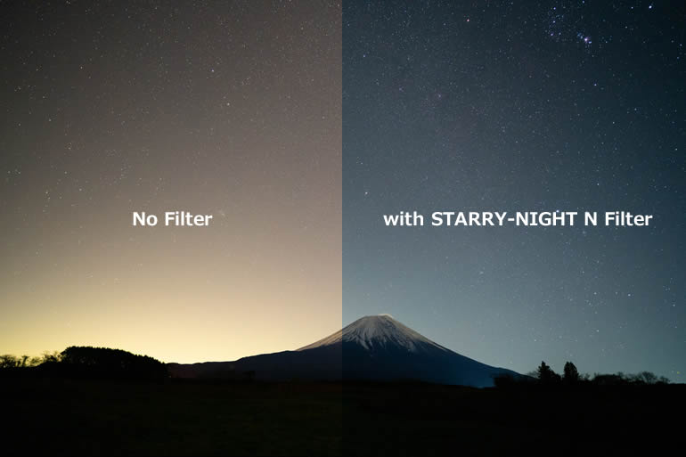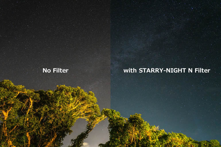 ○スターリーナイトフィルターは光害をカットするため、レンズに入る光量が減少します。スターリーナイトフィルターの露出倍数は1/3絞り分です。星空をマニュアル露出で撮影する場合、フィルター無で撮影した時と同じ設定で撮影すると露出アンダーになりますのでご注意ください。夜景などを撮影する場合はカメラ側で露出が調整されます。